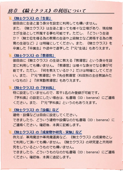 《騎士クラス》学科長をキャラの設定としたい方がおられましたら、私書箱「banana」にご連絡ください。