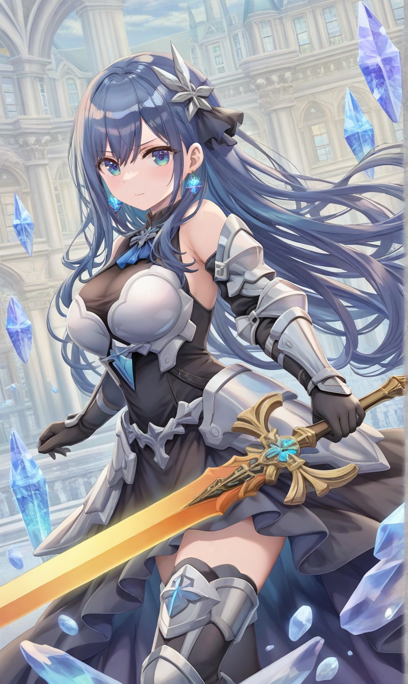 装備:魔剣、遺跡で発見をしたもの。切れ味がよく、魔力を切れ味に変換し鋭さを増す。 防具:黒いドレス状の服の上に鎧をまとう。