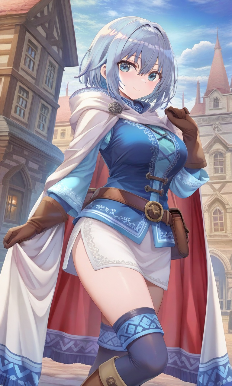 【服装】 青い長そでのブラウスに青いベスト、スカート。 足元はブーツで固め、短いマントを羽織っている。
