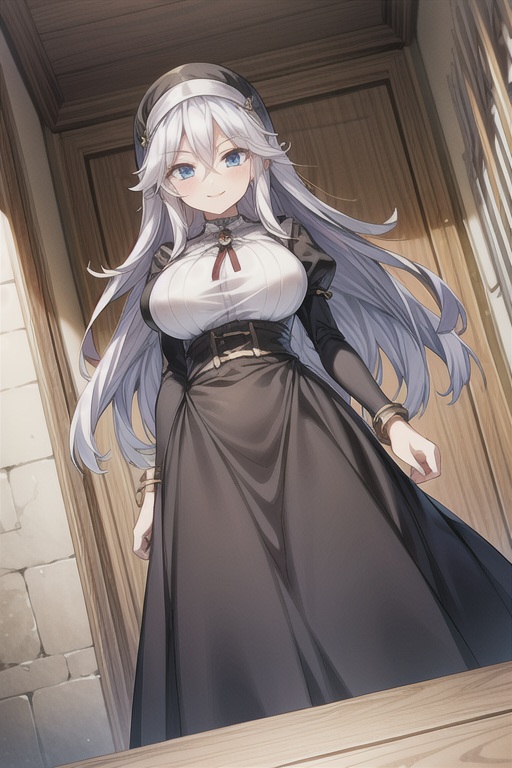 【容姿】 腰に届く長さの灰色の髪、前髪を瞳の間に流している、淡い青い双眸 豊かな乳房、くびれた腰、足が長く腰の位置が高い 艶やかな髪質、ハリのある肌 黒と白のシスター服、ベールを纏う 160cm B88W58H84 50kg