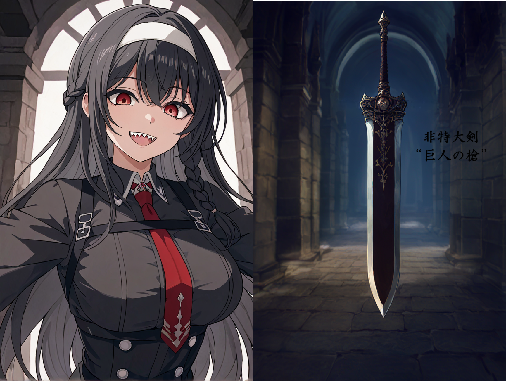 「非特大剣 巨人の槍」 古代鍛鉄製法の巨人族の武具を利用して作られた手直し品 全体は両刃の巨剣 身幅はほぼ均一で先端が少し細まっている。 黒鉄の地肌と、研がれた白い刃が覆う淵側と無骨そのもの。 付け根はナマクラで先端に行くほど鋭く仕上がっている。
