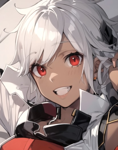 【外見】 身長149cm、体重50kg 耳が隠れる程度の長さの白髪に、愛嬌のある赤い瞳 細身でまだまだ筋肉も薄い発展途上を伺わせる薄褐色の肌。