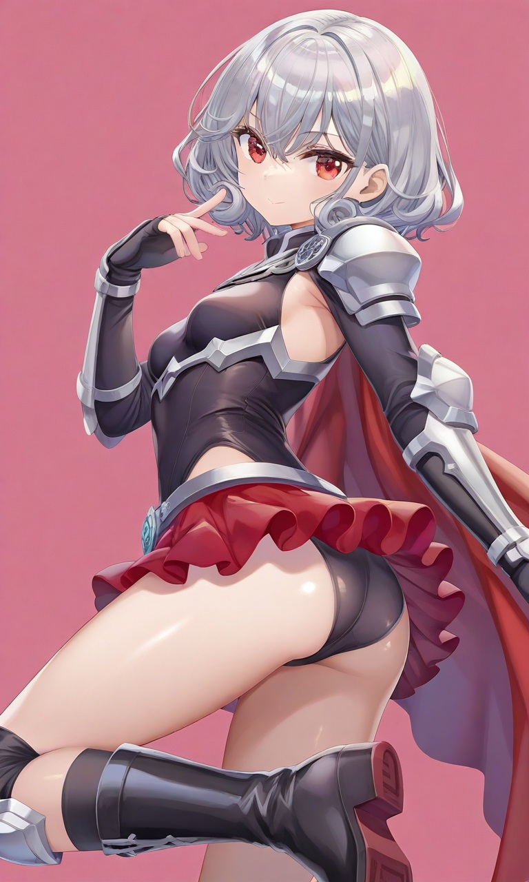 ・服装 黒色のハイネックレオタード、赤いスカート、ニーブーツ 肩、肘、前腕、膝に金属製の部分鎧 胸元は金属フレームを装着、腰には金属製ベルト
