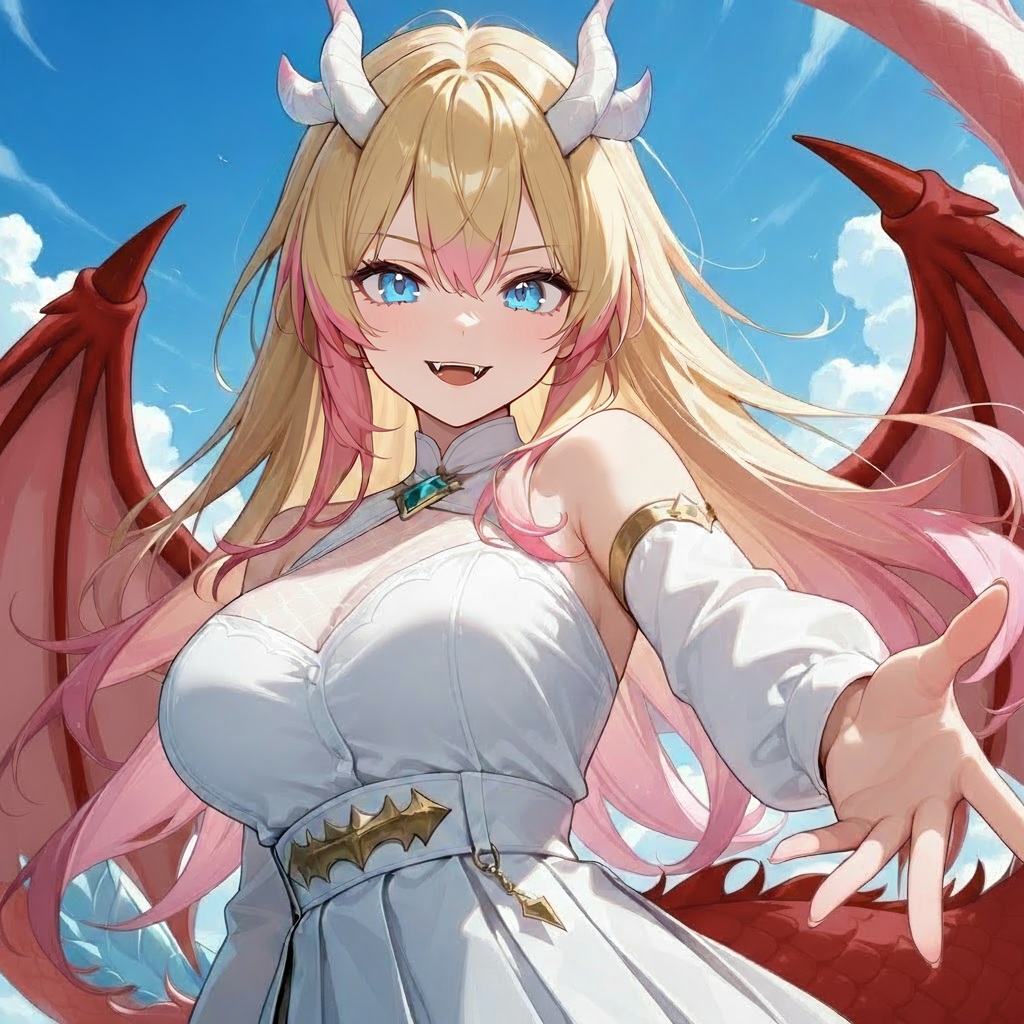 外見(人竜時) 頭部に小さな角 背中に紅竜鱗の竜翼 お尻から垂れる、紅鱗の竜の尻尾