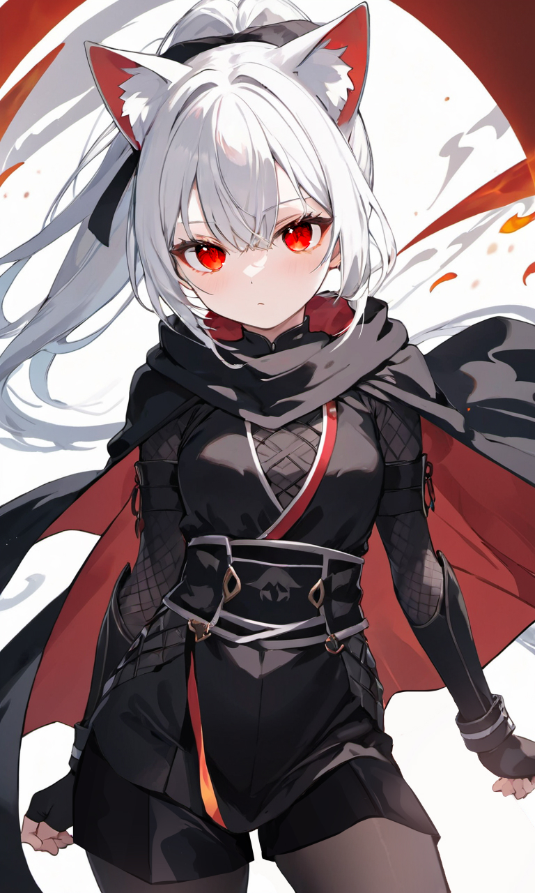【名前】 篝(かがり) 【年齢】 18 【種族】 ミレー族(猫) 【身長】 153p 【体系】 小柄で華奢だが出るところは出てる。 忍装束を着ている時はさらしを巻き体系をわかりにくくする。 【外見】 白髪ロングをポニーテールにする。緋色の眼。