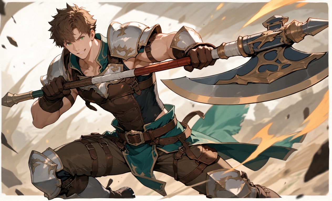 【簡易設定】 傭兵上がりの冒険者。 長身に、それに見合うだけのしっかりとした筋肉の鎧を身に着けた男。濃い茶色の髪を短く整えていて、翠色の目を持つ。顔立ちは野趣があふれるものの整ったもので、笑う表情には愛嬌もあったりもする。 要所を金属のプレートで補強しつつ、魔法を掛けて強化した革鎧に両手斧、という見るからに戦士、といった装備で、実際それに見合った立ち回りをする完全な脳筋戦士。 金使いはいい意味で悪く、まとまった金を稼いではすぐに溶かしてまた稼いで、と。人生を楽しんでいる生き方をしている。