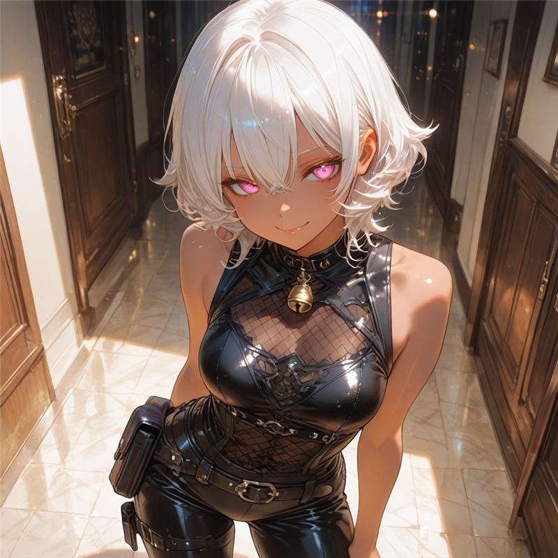 顔立ち 白い髪の毛はショートヘアにしてある。 眼は、深紅の瞳で、やや釣り目で、気の強そうな視線を持つ。 唇はぷりんとしていて、ローズピンク。 頭部には角は持っていない。