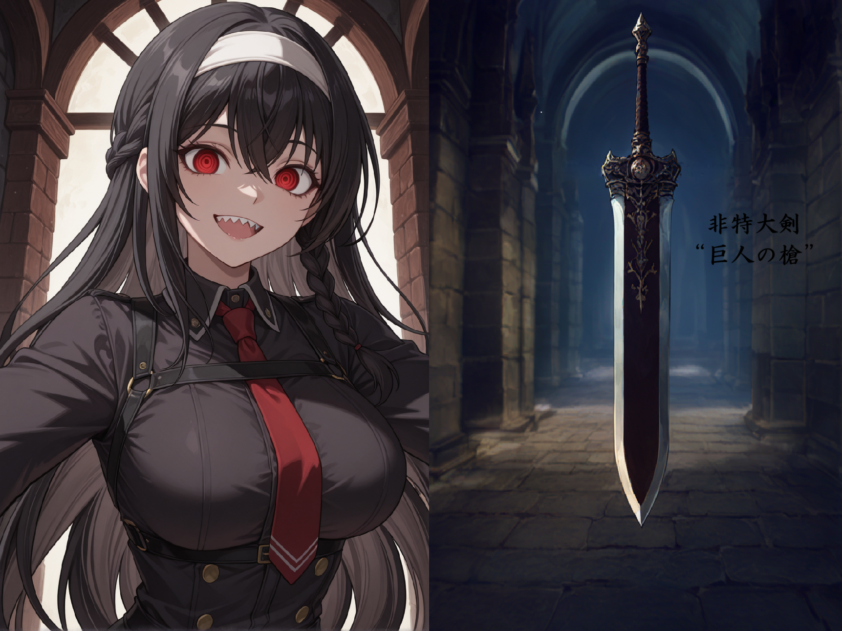 「非特大剣 “巨人の槍”」 古代鍛鉄製法の巨人族の武具を利用して作られた手直し品 全体は両刃の巨剣 身幅はほぼ均一で先端が少し細まっている。 黒鉄の地肌と、研がれた白い刃が覆う淵側と無骨そのもの。 付け根はナマクラで先端に行くほど鋭く仕上がっている。