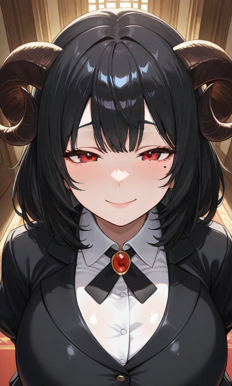 外見 漆黒の髪の毛は、ソバージュのミディアムヘア 側頭部に羊の角を生やす。 白人系の白い肌で、瑞々しい艶を持つ。 紅い目、垂眼、目元に泣き黒子 普段から困ったような笑みを浮かべている。 しっとりとした薄桃色の唇