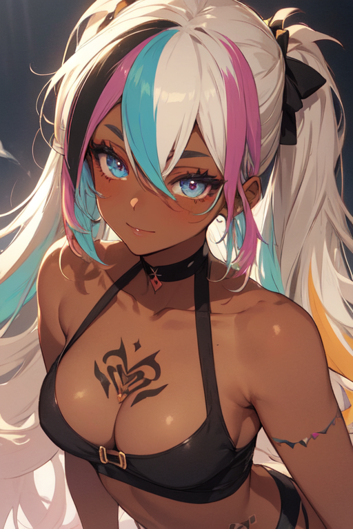 ・腰ぐらいの白銀髪に空色、ピンク、黒のメッシュが入ったレインボーカラーをツインテールにしている ・日焼けした褐色肌のいわゆる黒ギャル ・蒼い二重の眼をシャドーやマスカラでぱっちりくっきりさせている。ギャルメイク ・胸元、二の腕にタトゥあり。いずれも自作。