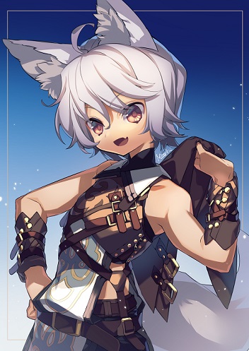 ●容姿 白い髪と琥珀の瞳。パッチリ活発そうな顔。笑うと牙がよく目立つ。 年なりのチビさと細さ。服は平服としても冒険用としても使用可能なレザー装備。 (特徴を発現させると大きめの狼耳と狼尻尾)