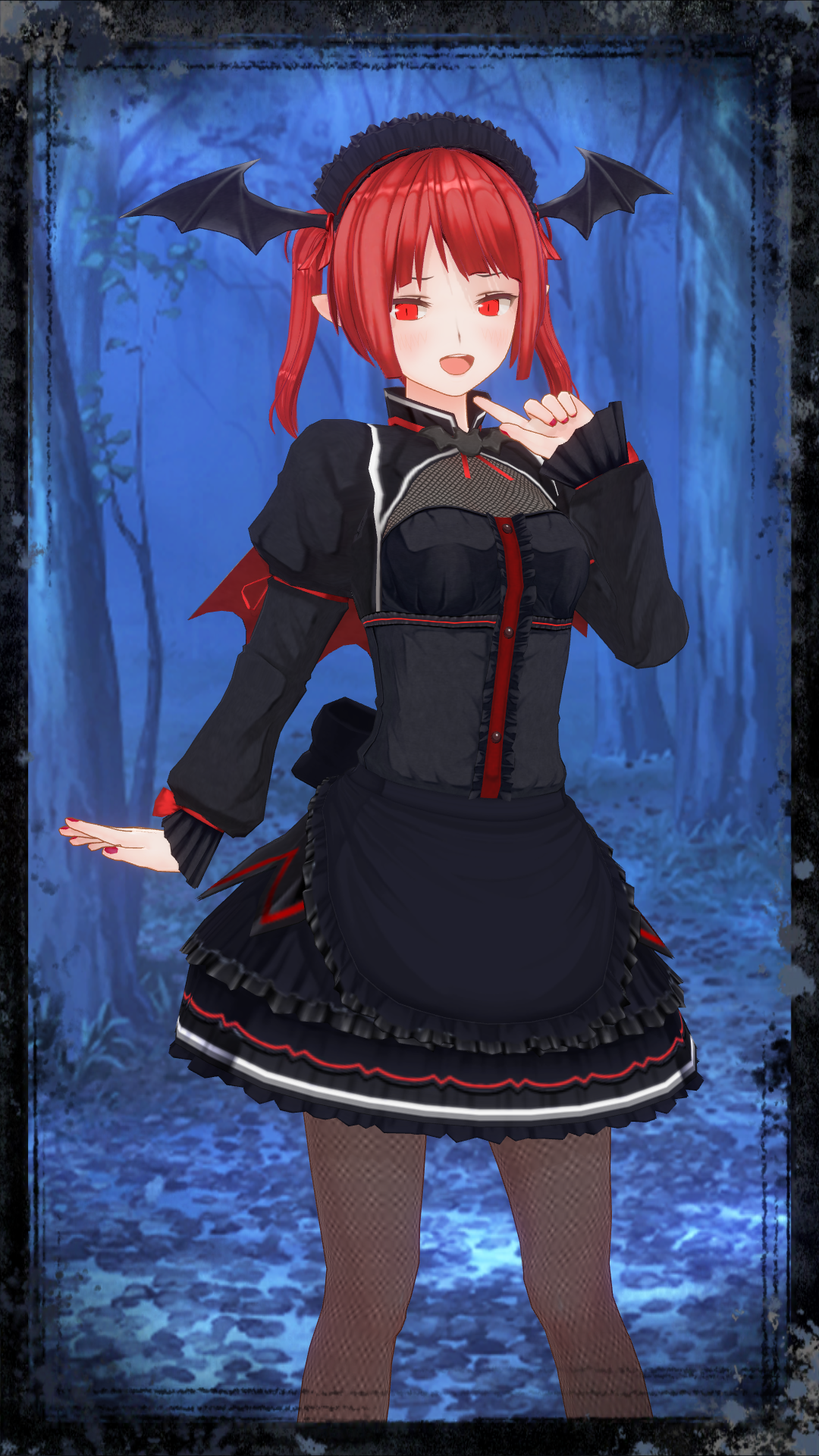 【容姿】 身長約150p、胸は膨らみかけの子供体型。 赤毛のツインテールに紅の瞳、尖った耳。 肌は日焼けの無い白で染みもなく若々しい。首から下は全くの無毛。 悪魔系魔族特有の翼と尖った尻尾を生やしている。