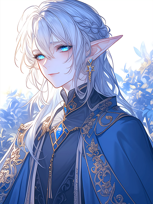 肩甲骨下までの長さの青銀色の髪。 アーモンド形の二重双眸。ベイビーブルー色の虹彩。 エルフの特徴である先端の尖った長耳。 必要最低限鍛えてはいるが、筋肉よりも柔軟さと素早さが重視された撓やかな体付き。 某日より両の乳首へ銀のピアスが施されている。