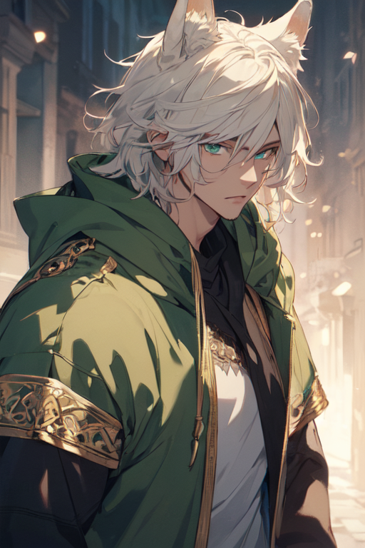 緑色のフード、旅人の服。白い狼のしっぽ、白い髪と黒い肌