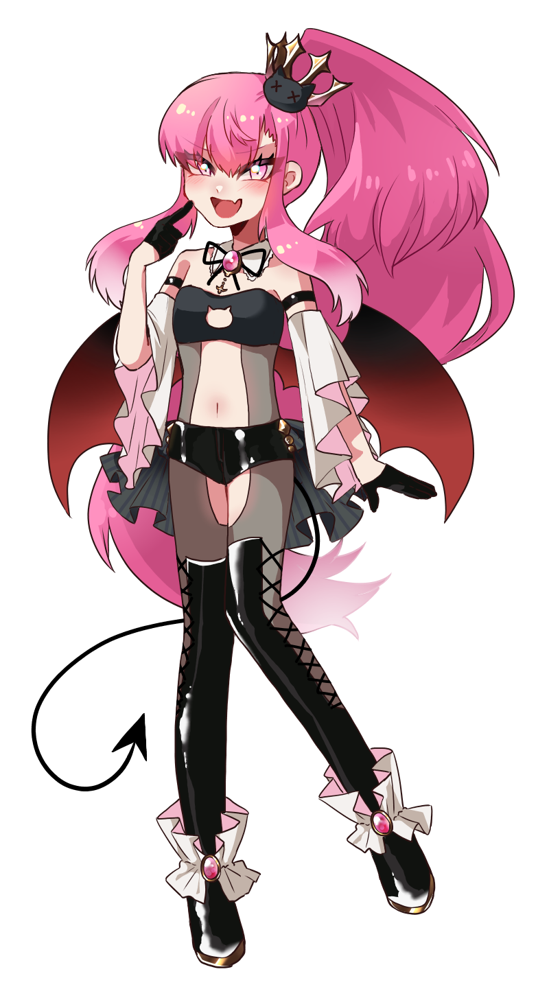 【キャラクター概要】 身長140cm メスガキ。 真黒の胸元がぽっかり空いたビキニ姿。ただしぺったんこ。 暗闇でも映える明るい桃色の髪。子供らしい右側サイドテールヘア。 仄かに輝いて見える明るい桃色のツリ目。 メスガキ。 コウモリのような黒い小さな羽根。先端三角系の小悪魔尻尾。一目で魔族、サキュバスと分かる格好。