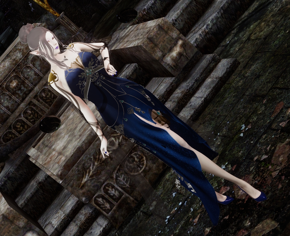 青く身体の線が分かりやすいドレス。肩の後ろ側には布飾りに見える薄い刃を垂らしている。足元は青いパンプス。寒暖の差により衣装を調整するためいつもこのドレスを着ているとは限らない。