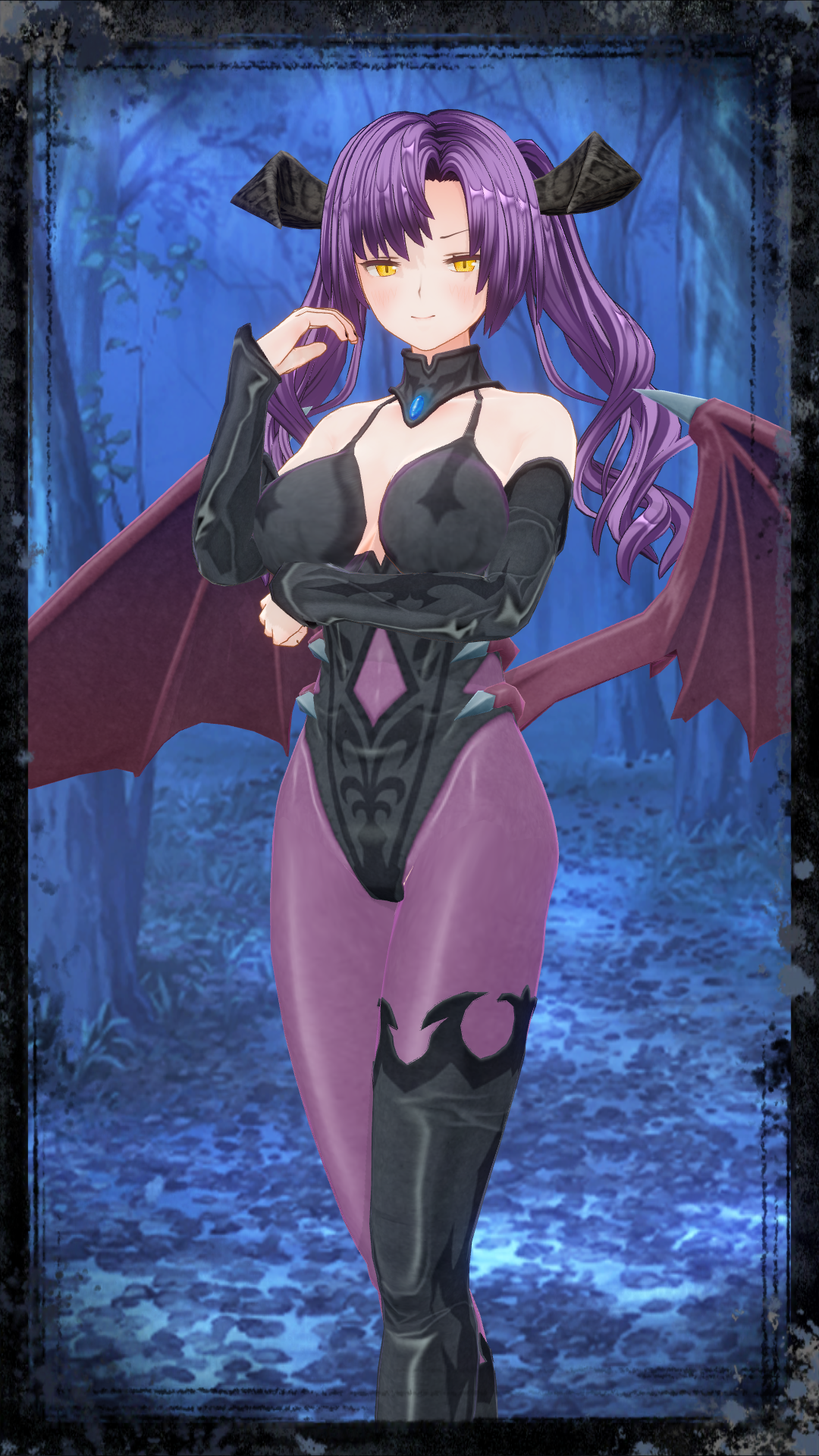 【容姿】 身長168p、B97/W62/H93 紫色の長髪ツインテール、琥珀色の爬虫類めいた瞳。鍛えられ締まっているも肉付きの良い体、白い肌。 首から下は無毛。乳首、陰唇は濃い桃色。頭に角、背中に蝙蝠じみた翼が生えている。