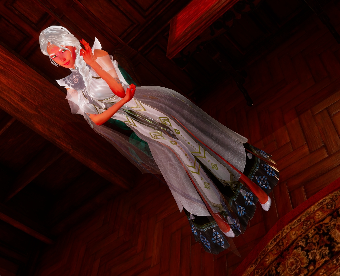 白いドレスには刃や矢を避ける魔法がかかっている。アクセサリもそれぞれ魔術や呪いを避けるような永続的エンチャント有り。