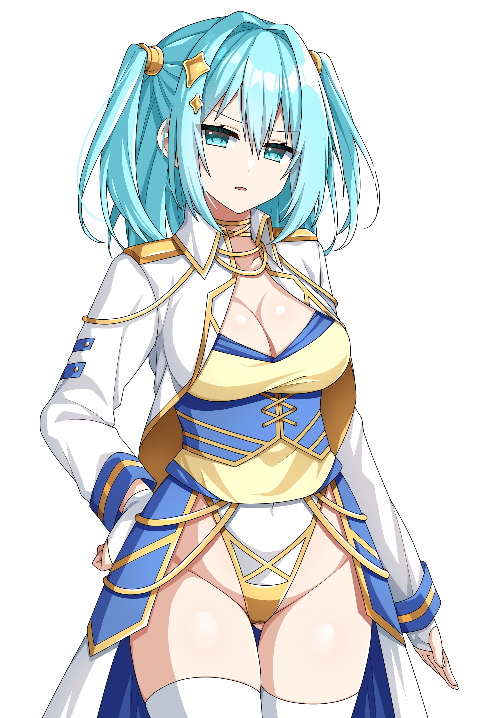 【服装】 青と黄色、白のレオタード 白い騎士服風のコート ハイサイソックス、ブーツ
