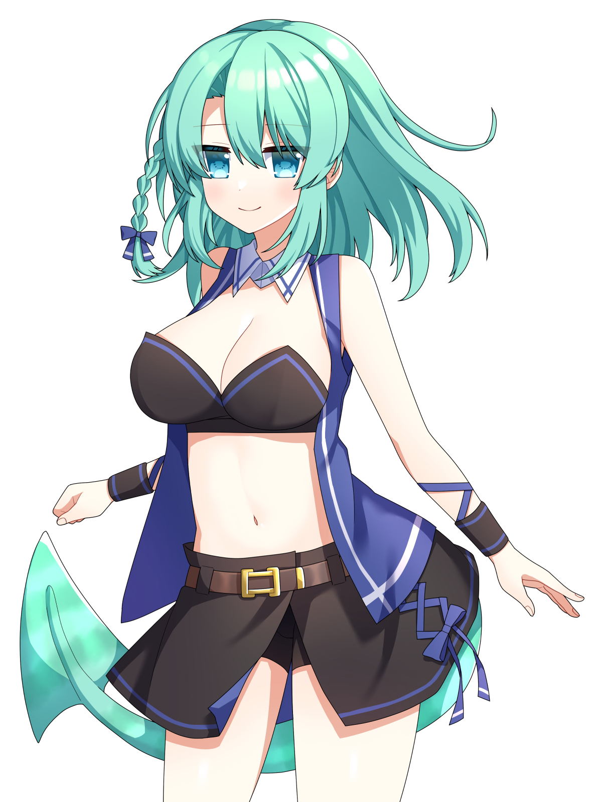 【外見】 明るい緑み掛かった青髪。白い肌。明るい笑み。 服装は平時は黒い胸当て、ショートスカート、スパッツ 冒険時はビキニアーマー