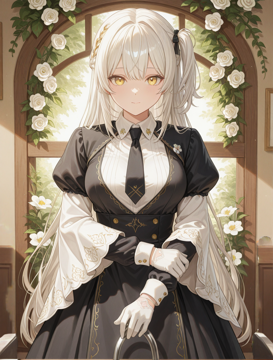 白金のようなサイドテール付きロングヘア 一房の金のメッシュを編み込みで表している。 黄金瞳