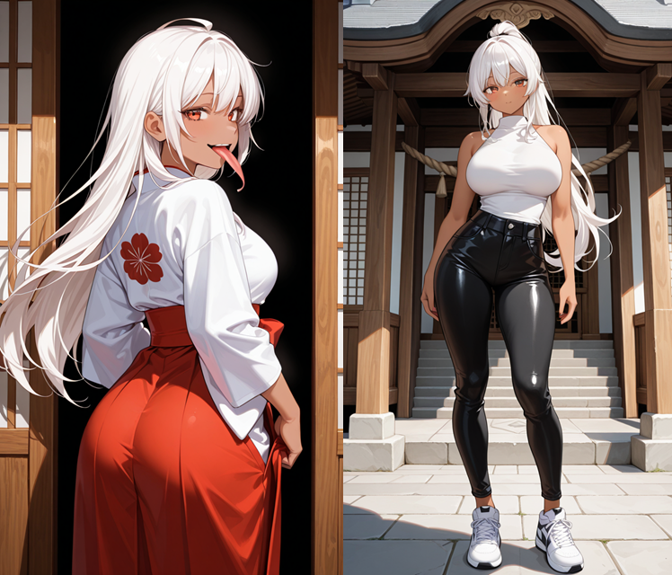 洋装Ver ハイネックタイプのタンクトップ。 革製のパンツ 白いスニーカー。 ベージュのビスチェ、ショーツ。 アクティブさを出すためにポニーテールへ。