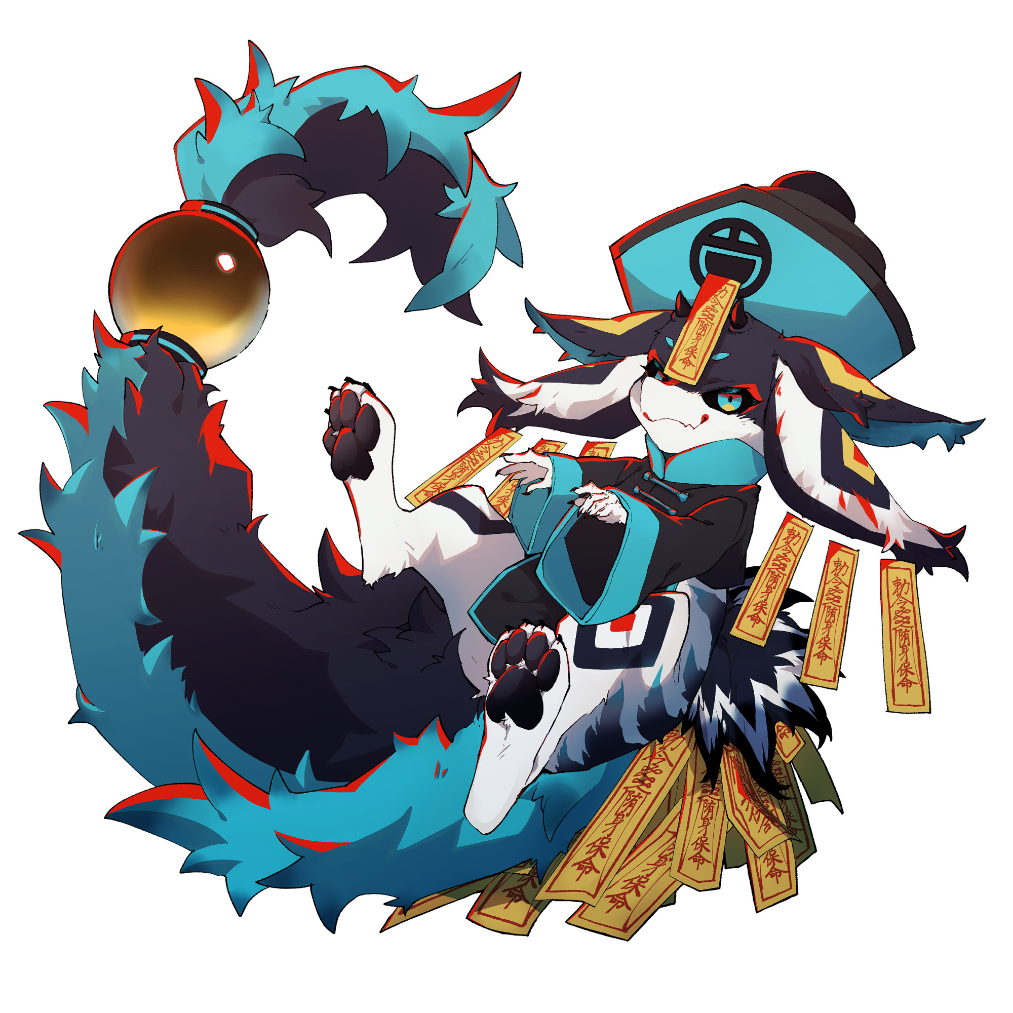 【パーソナルデータ】 名前:凰魔(おうま)と呼ばれていた。本名は別にあるが、今はこれを名乗っている。 身長142cm 体重29kg (本体は身長212 体重227) 目の色:黒白眼の青色 毛並み:白・黒・青のモフモフ シェンヤンの着物に身を包み、全身に封印の札を貼られている