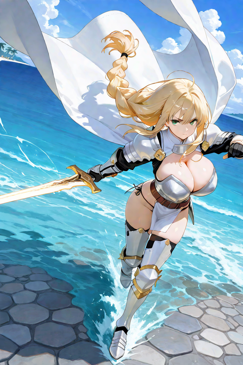 職務中は兜を外したフリューテッドのフルプレート。 白を基調とし所々に緻密な金装飾の入れられた美麗な鎧だが、中身は総アダマンタイト製という常軌を逸した重量物。 その分、魔法防御も含めて防御力は堅牢の一言。 コルセット型の胴鎧がたわわな魔乳だけは鎧わずに薄手の聖衣で前掛けめいて押さえつけ横乳を見せびらかしているのも、短裾の前垂れしか存在しない腰部分が貞操体の食い込む股間をむっちむちの太腿と共にチラ見させるのも、行き遅れた処女の悪あがきの結果。 鎧の腋が不自然に空いているのは臭いが篭りやすい事を気にしての事だが、それもまた無駄なエロスを作り出すのに貢献している。ちなみに、鎧下を着てそれを隠している時は、腋毛の処理が出来ていない時というのは騎士団員にとっては暗黙の了解となっているらしい。