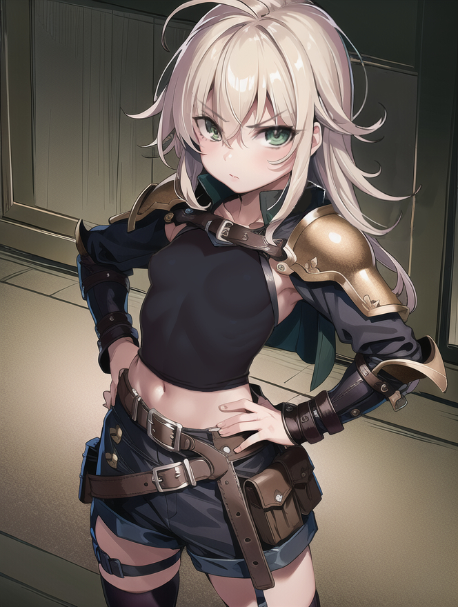 《装備品》 ・深緑色を基調としたレンジャースタイルの野外戦闘服 下半身はキュロットと黒タイツ着用 ・フード付きのマント ・手の甲部分を簡易装甲プレートで保護した指が露出するタイプの革手袋 ・頑丈な革製のブーツ。脚の甲部分を軽金属の装甲板で補強してある