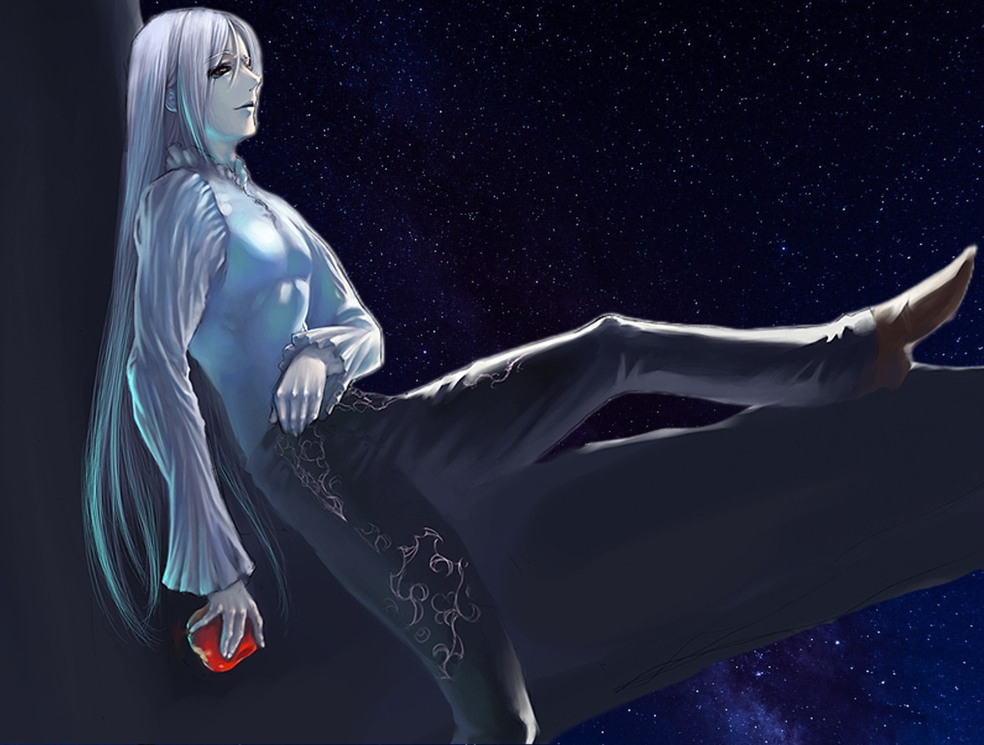 【外見・体格・装い】 身長189cm、体重70kgの長身痩躯。 腰まで流れる銀糸のような髪は手入れが行き届き、冷艶な輝きを纏って揺れる。 切れ長に垂れた葡萄色の瞳は、常に微笑を浮かべる口元と共に謎を孕む。 一見すると着痩せして見えるが、服の下には鍛え抜かれた鋼の肉体が潜む。 その肌にはかつて“騎士”として戦った証、刃の痕がいくつも刻まれている。