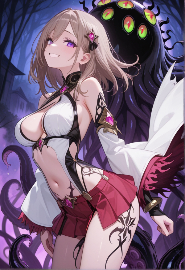 | 容姿 | 後述、画像参照。身長159cm、肩につくくらいのくすんだ金髪の露出の高い巫女服姿 |