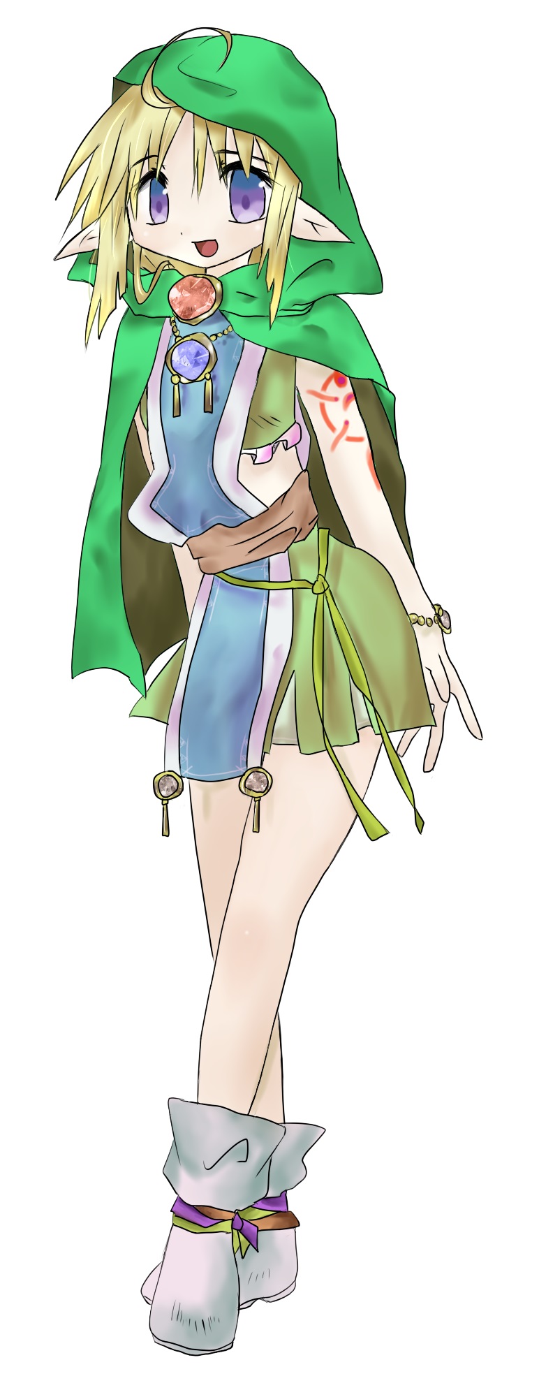 【服装】 常盤色の上着とスカート、胸元にはアメジストのアミュレット 外出時には若竹色のフード付きのショートマントを身に着ける、