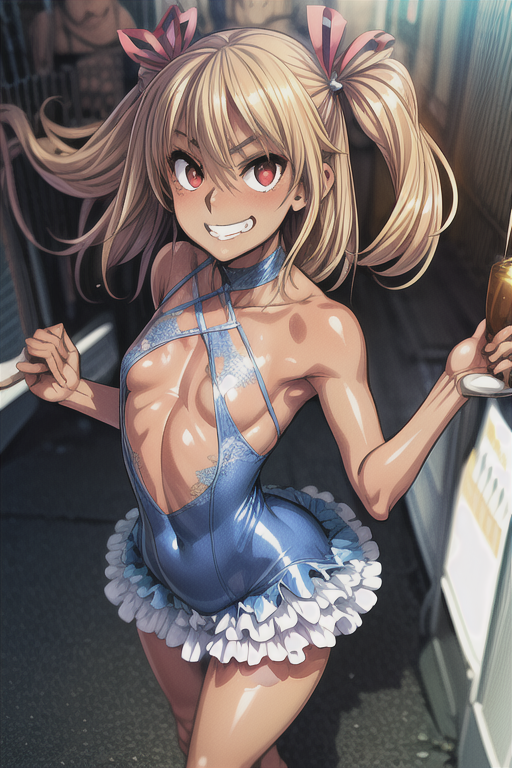 赤銅色の肌に、光の加減で紅く見える目、くすんだ金髪はボリュームがあり肩まで垂らした上で両サイドを結える。 幼さを残した利発そうな顔立ちで、猫をかぶってひょうきんに笑えば非常に人当たりの良い雰囲気になるが、時に見せる勝ち気で狡猾な表情は人の危機感を煽る。 体格はメリハリに乏しく小柄な印象になるけれど、手足が長めで運動神経は良さそう。実際鍛えられており、ほっそりした骨格に対して太もも太目でお尻大き目。腹筋は縦に割れている。