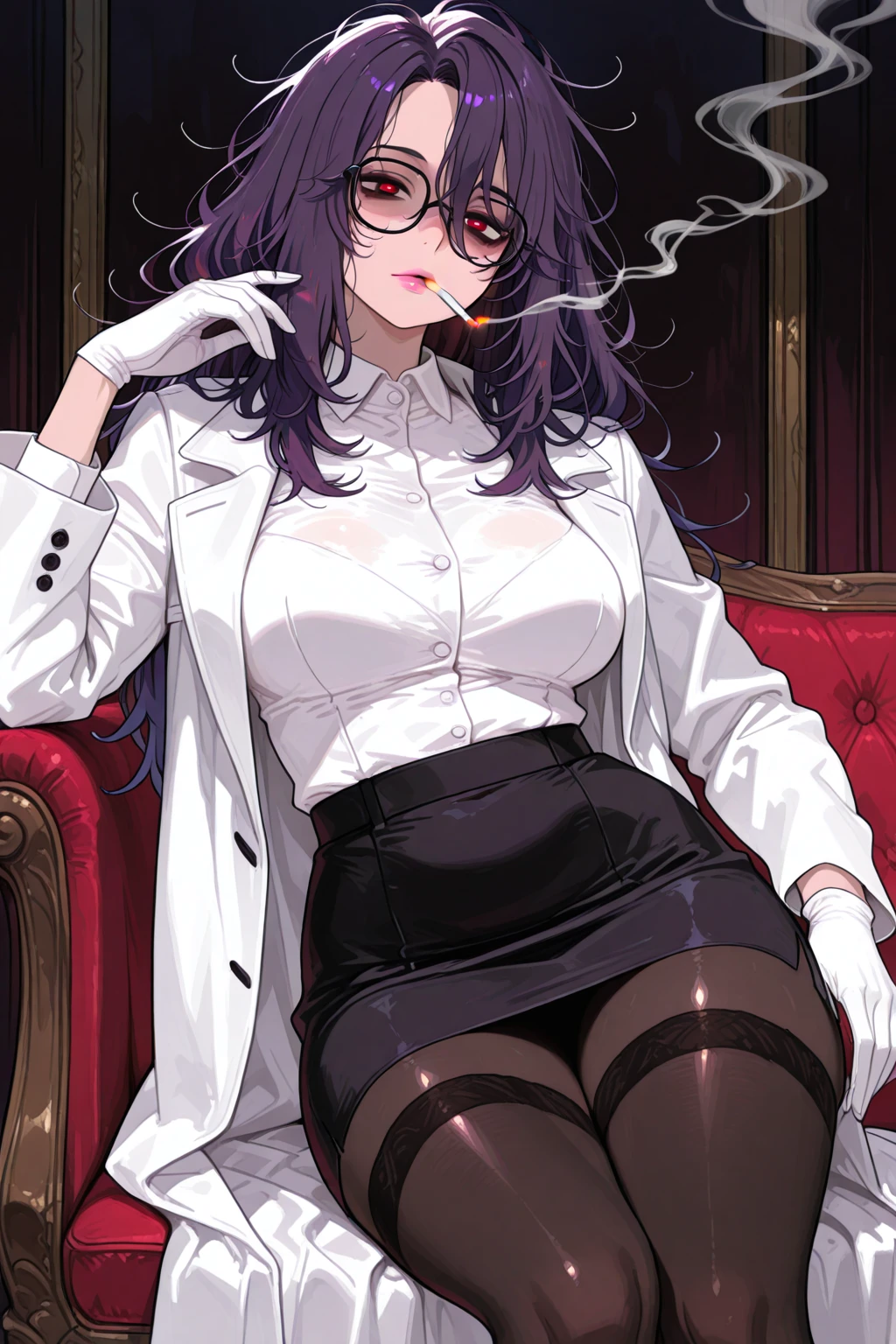 容姿/ 身長は160cmほど。B85(E)・W60・H89 腰まで流れる深紫色の髪は、手入れが薄くいつも雑に流されている。 緋色の三白眼は見るものに胡乱な印象を与える。 作り物のような滑らかな肌は白い。場所に寄っては不健康に見えるかもしれない。 釣鐘型の柔らかい乳房、肉付きの良さが見て取れる腰つき。 黒く細いつるのラウンド型眼鏡。 仕立ての良いシャツに、タイトスカート、ストッキング。 下着はレースをあしらった黒基調のもの。 白い手袋をしている。足元はローヒールのショートブーツ。 屋外では白いロングコートを着ていることが多い。 人間の領域に訪れるときは、きちんと人間の振りをしている(つもり)。