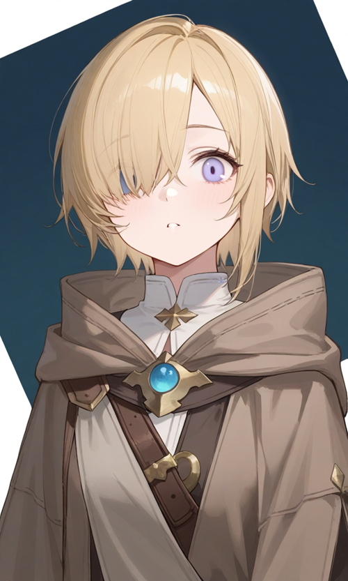 外見 短いブロンドの髪は左横だけ少し長く、前髪は伸ばしていて右目を隠す。 左右で微妙に異なる色合いの瞳。左は紫、右はやや青みがかっている。 身長156cm、細身。B86×W55×H90。