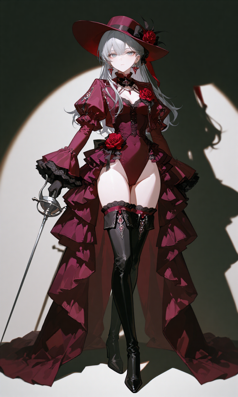 薔薇のコサージュを各所にあしらったワインレッドのドレスをアレンジしたハイレグレオタードの衣装を恥ずかしげもなく着こなし、長くしなやかな足を革ブーツに包み、傷一つない肌に、静かに輝くような銀色の長髪を流す。
