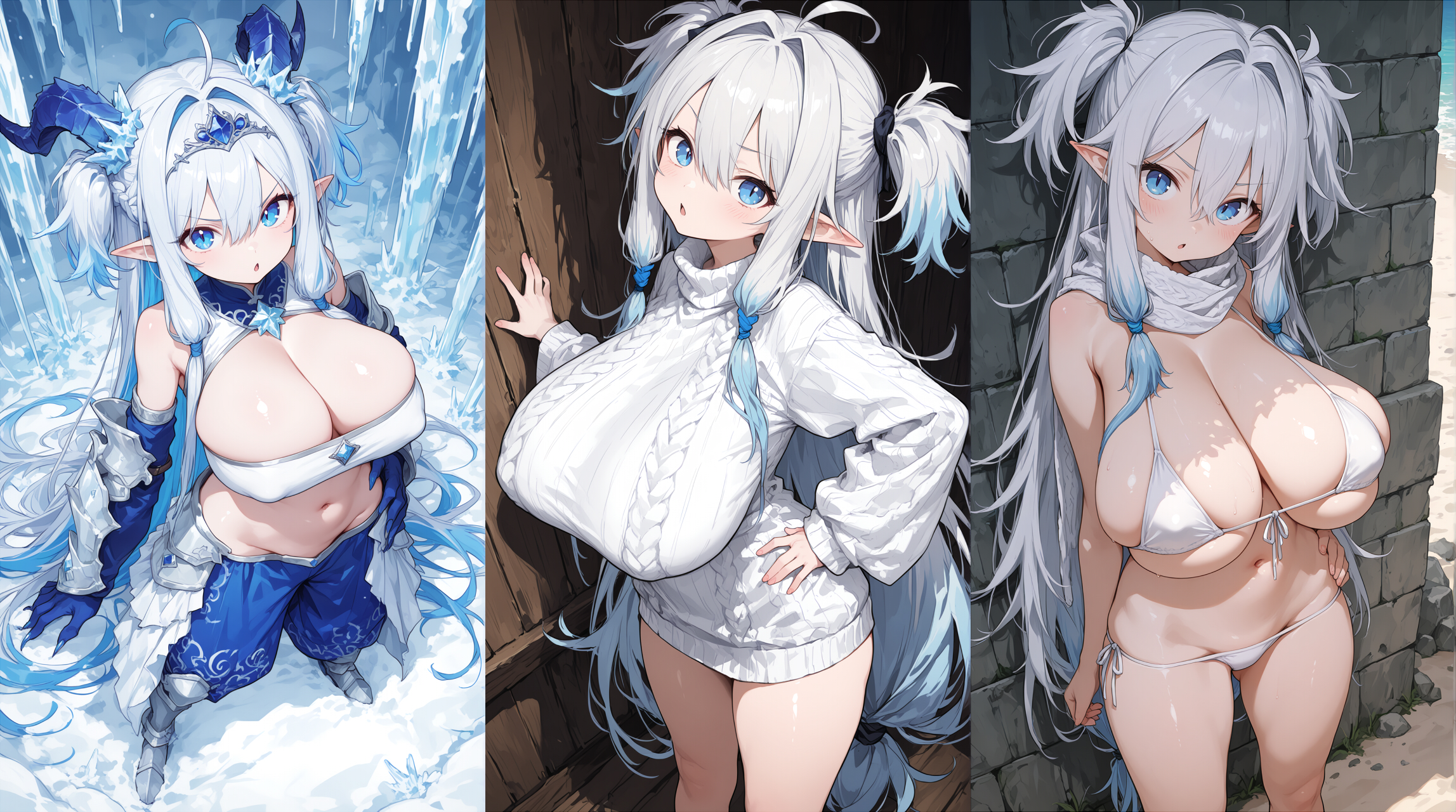 ふわふわとした柔らかな質感の純白の髪。 龍の魔力が満ちる程、髪の先端と内側が蒼く染まる。 一部を上品に小さく結ったツーサイドアップが拘り。 風に揺れるとミントの様な爽やかな香りがふわりと香る。 大きなサファイア色の瞳は少し吊り目。ぱっちり二重で活発的。 透き通る様な白い肌。胸・尻。太腿はもちもち。腹部はすべすべ。 胸やお尻の大きさは魔力総量、髪肌の瑞々しさは質の高さを表している。 本来は人間の子供と大差ない体型だったが、龍の血と魔力を浴びた事で 体質の変化と共に現在の体型となった。種族としては本来有り得ない体型。