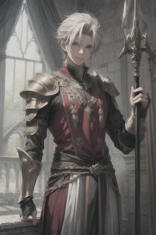・容姿 183cm 父と同じ白銀の髪を残腹に短く切りそろえている。 大柄な体系の父ほどではないもののがっしりとした筋肉質な体つき。 赤い瞳を持ち、右目には縦に切り傷の跡が残る。