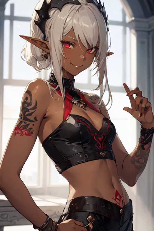 ・容姿 褐色の肌にしなやかに引き締まった体つき。 小ぶりなおわん型の胸を持ち、乳頭などは綺麗な薄いピンク。 目じり上がりの切れ目で左目の下に小さなほくろがある。 視力は良いのだが普段は疲れるため、フレームのない眼鏡をつけている。 耳はエルフらしく長くとがっている。