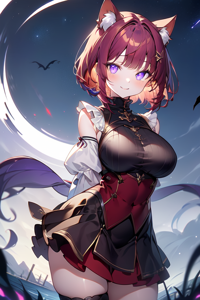 【容姿】 赤いショートヘア/紫の瞳/猫耳と尻尾