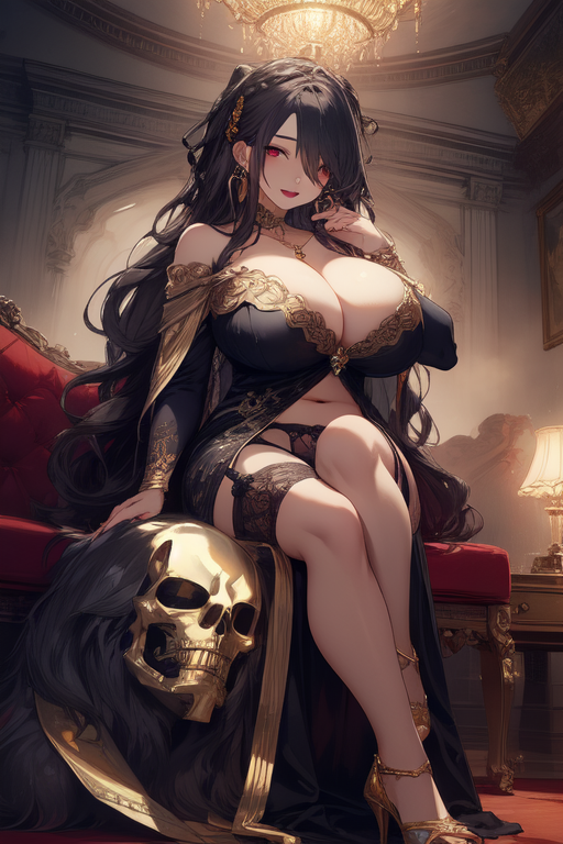 🏴☠️容姿🏴☠️ 艷やかな黒髪のロングウェーブ。 冷たさを感じさせる暗赤の瞳。 胸から腰にかけてのラインは極めて豊満。 ジョリーロジャーの刺繍の目立つ黒のドレス。 全身のあちこちに金銀のあらゆる装飾を纏う。 戦闘時にはカトラスを腰に吊り、背には髑髏装飾入りのフリントロックライフルを背負う。