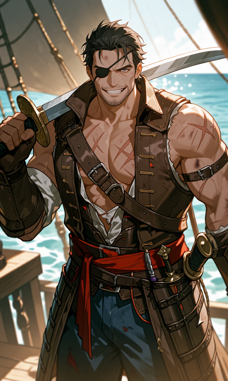 髪 :暗茶色 目 :鳶色 肌 :濃い日焼け色 他 :右目に眼帯。顔、体に無数の傷跡。