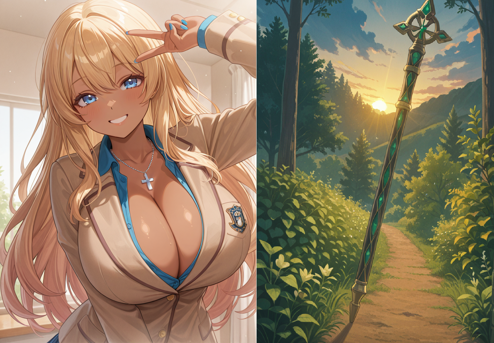 ≪外見≫ 165・99・60・95 金髪のロングと青い瞳 褐色肌に青い爪紅と全体的に天然物のギャルカラーであり意図的な物は爪紅のみ 褐色ブレザーと青いブラウス・スカートの組み合わせの学生服を利用している。 中心にある首飾りはロザリオではなく、十字路という交差、出会いを意味したお守り