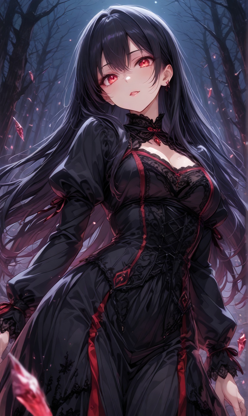 【容貌】 腰に届く黒髪、深紅の双眸、病的に白い肌、尖った犬歯 20代前後の若い女の姿 身長168、B84、W54、H73