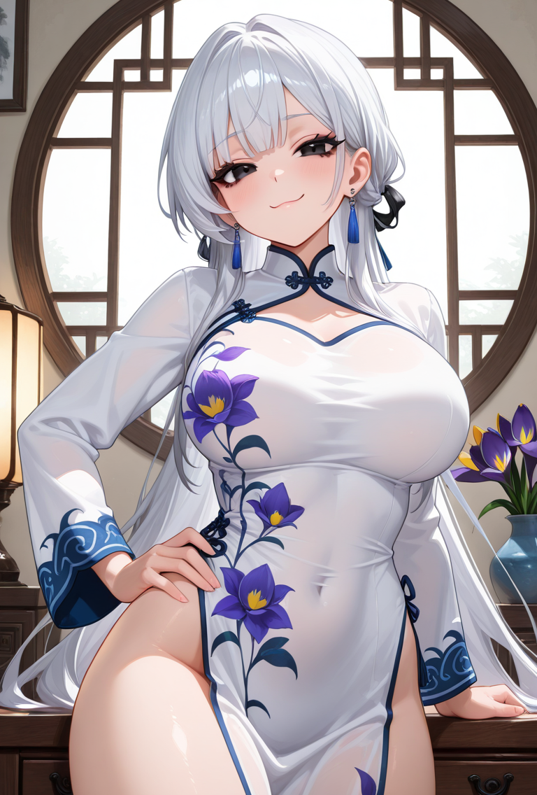 【外見】 太腿にまで届く長く艷やかな銀髪と、勝ち誇るような自信に満ちた漆黒の瞳。 透明感ある白の柔肌。天女を思わせる整った美貌。 優美にして尊大な生まれながらの支配者としての仕草。 四肢はしなやかに引き締まり、少女らしい華奢な肢体は理想的な均整を保たれている。 一方で、豊かな存在を主張する爆乳と細い腰回り、成熟した女を感じさせる尻肉や太腿を併せ持つ。 少女と女性の理想像を融合させたかのような魅惑的な容姿の女仙。