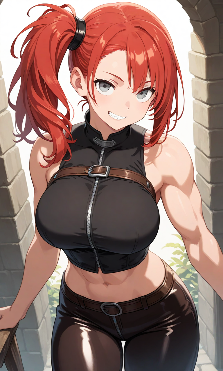 赤髪サイドテール、グレーの瞳、ギザギザの歯 不敵な微笑、筋肉質で豊満な肢体 仕事に取り掛かる時は腰に愛用の直剣を提げる(無銘だが切れ味良)