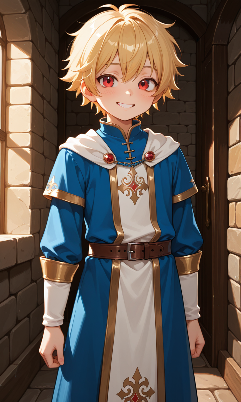 さらさらの金髪 ルビーのような艶やかに輝く赤い瞳 愛らしい、将来美男子となるであろう容貌 細い手足、女の子のような指 男としては高めの声 貴族の礼服をよく着用する 陰部は年相応の大きさ、勃起角度は急
