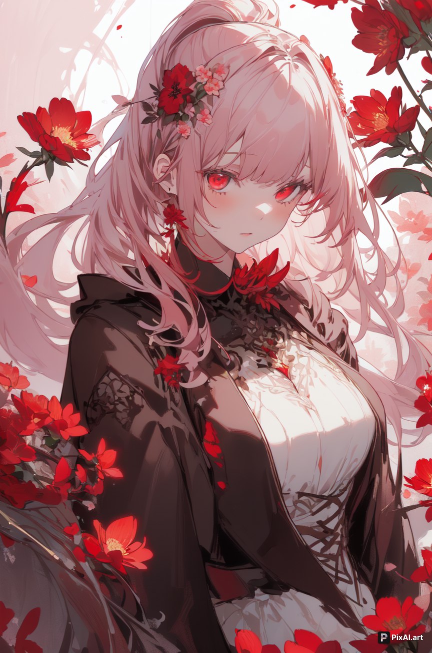 赤味の強いストロベリーブロンドを腰の長さまで。 大体リボンでまとめて流している。 ピンクロゼの双眸。 色白