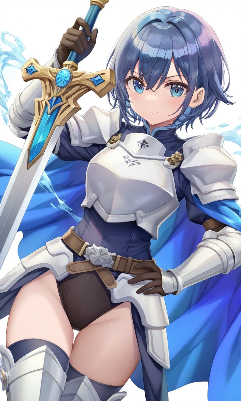 胴部: フルプレートアーマー(胸部) 外観: 白銀の金属製。青いマントと一体化。 特徴: 高い防御力を誇り、衝撃を分散。動きやすさを考慮した軽量化設計。 性能: 防御力★★★★☆、重量★★★☆☆、機動性★★★☆☆。