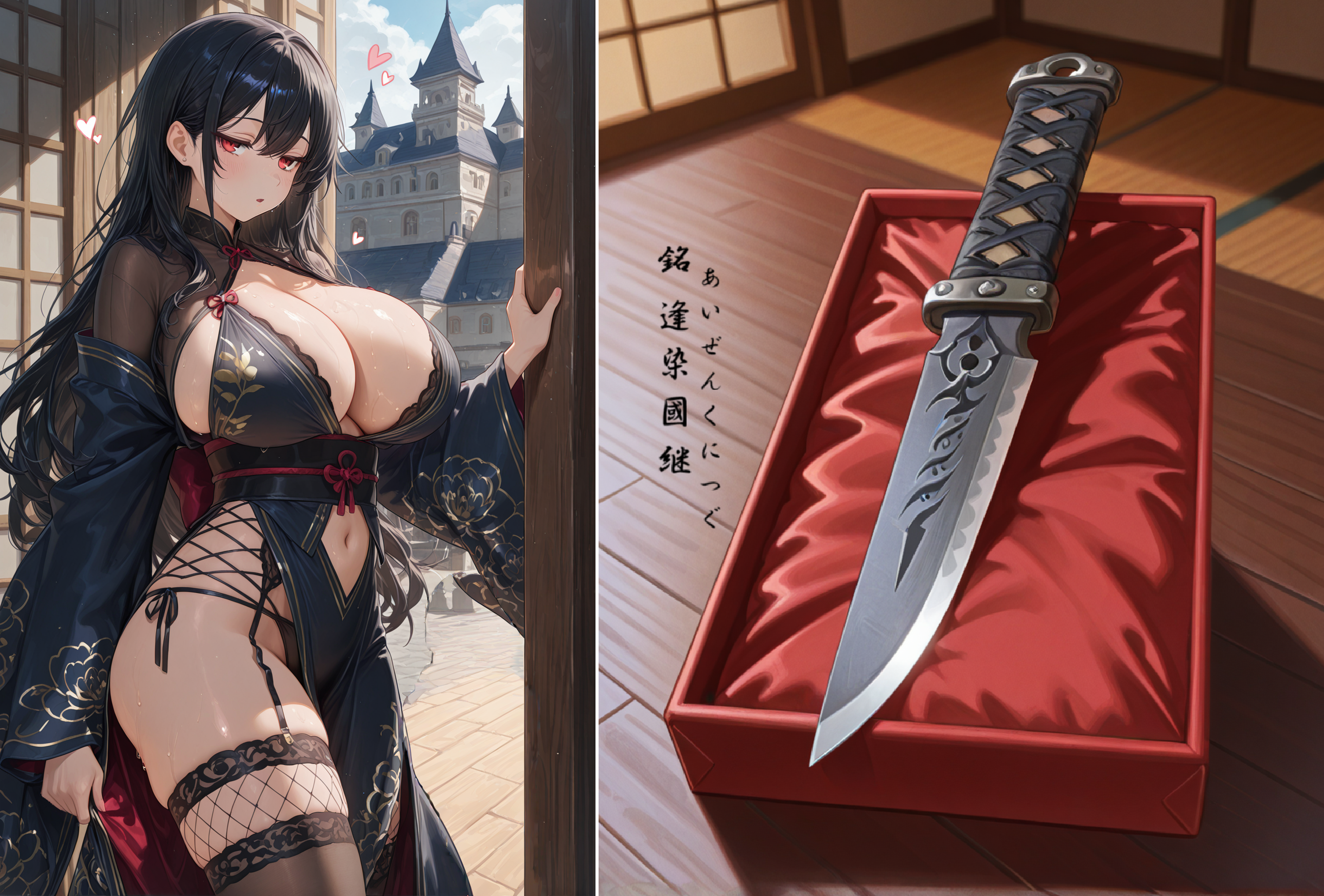 【服装】 ≪和洋折衷≫ 和洋折衷にまとめ上げた黒い衣 煽情的な作りの意匠 露出が多いように見え、いくつか武器を忍ばせている身形。 ※画像参照
